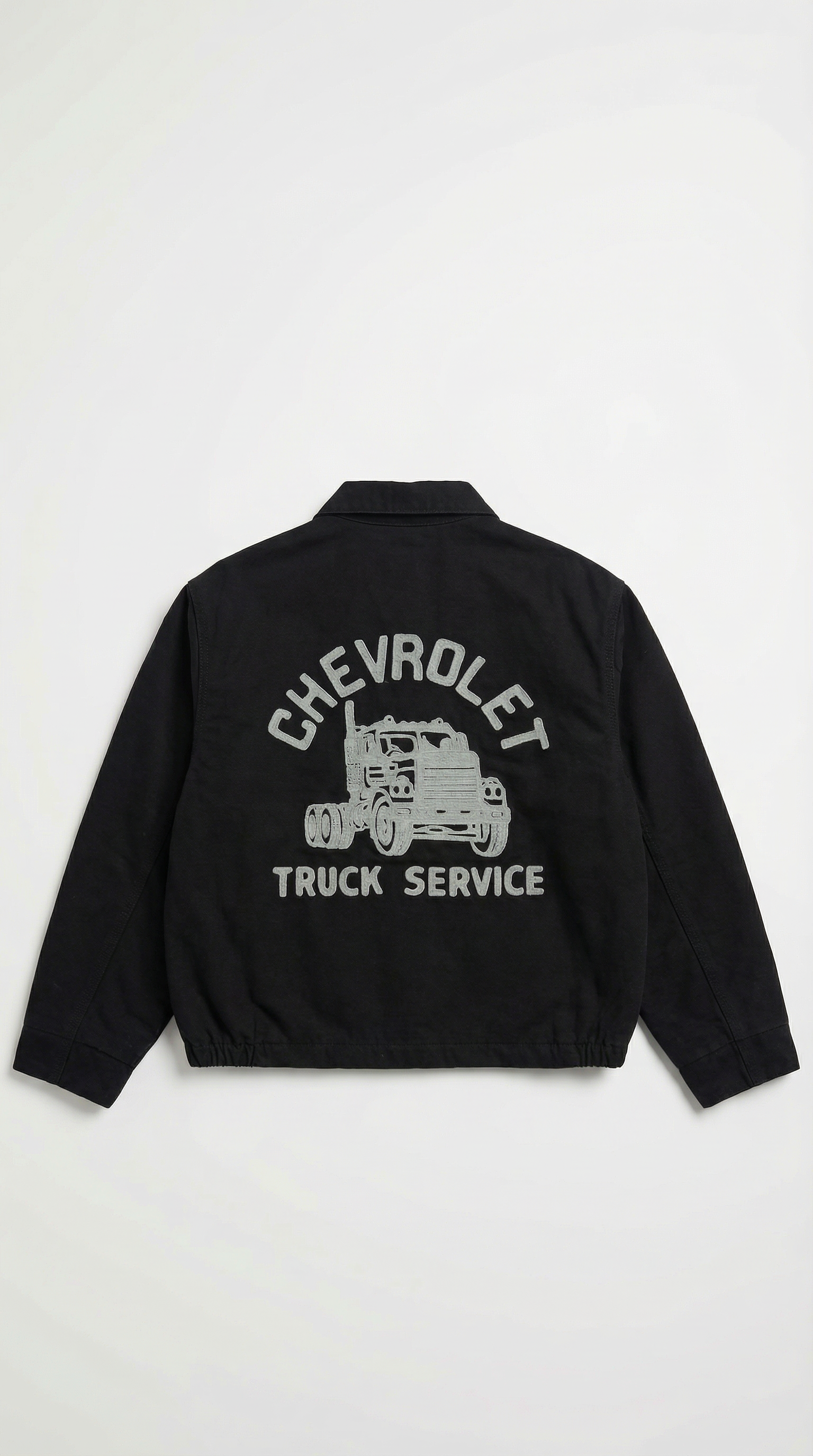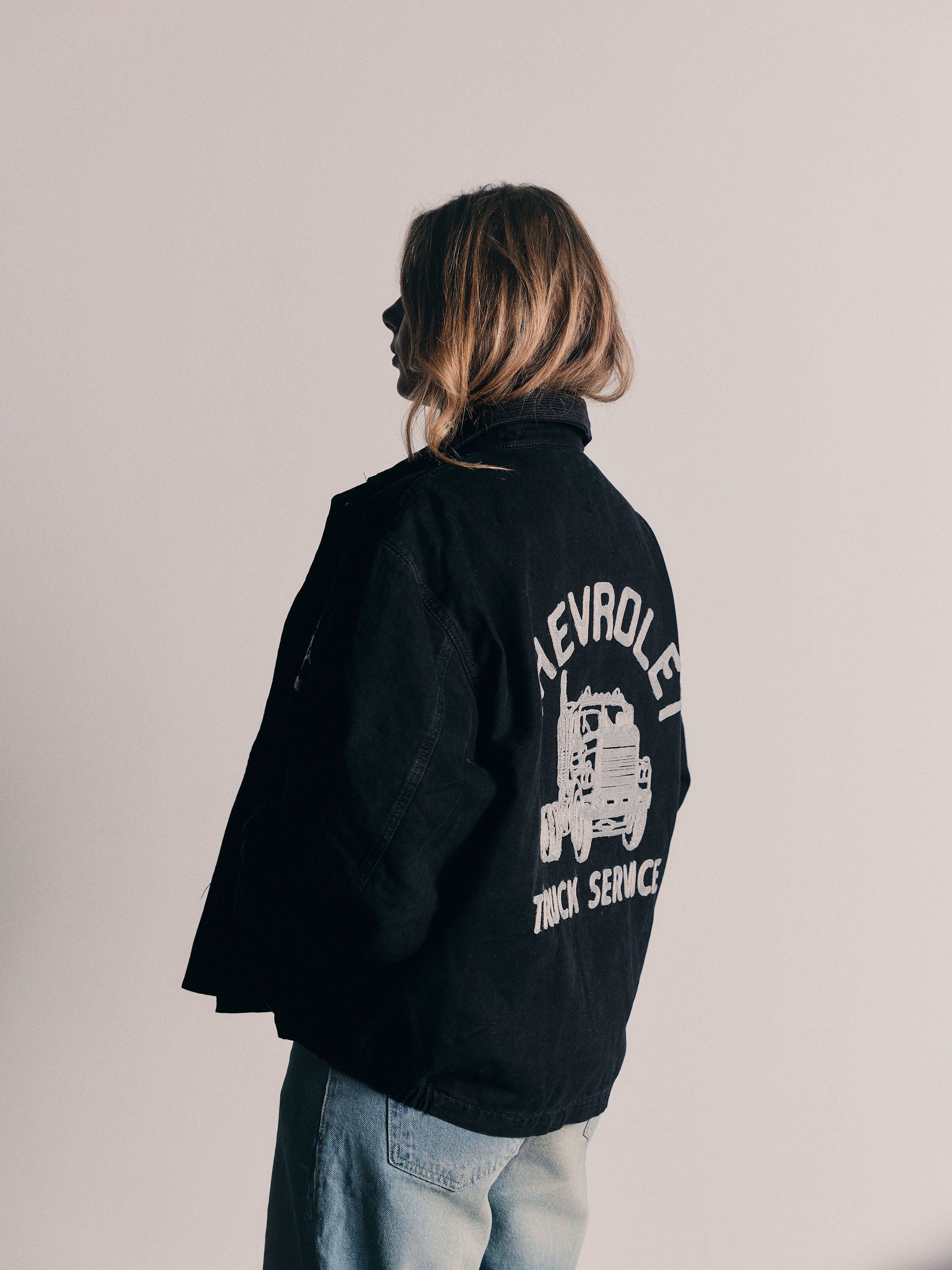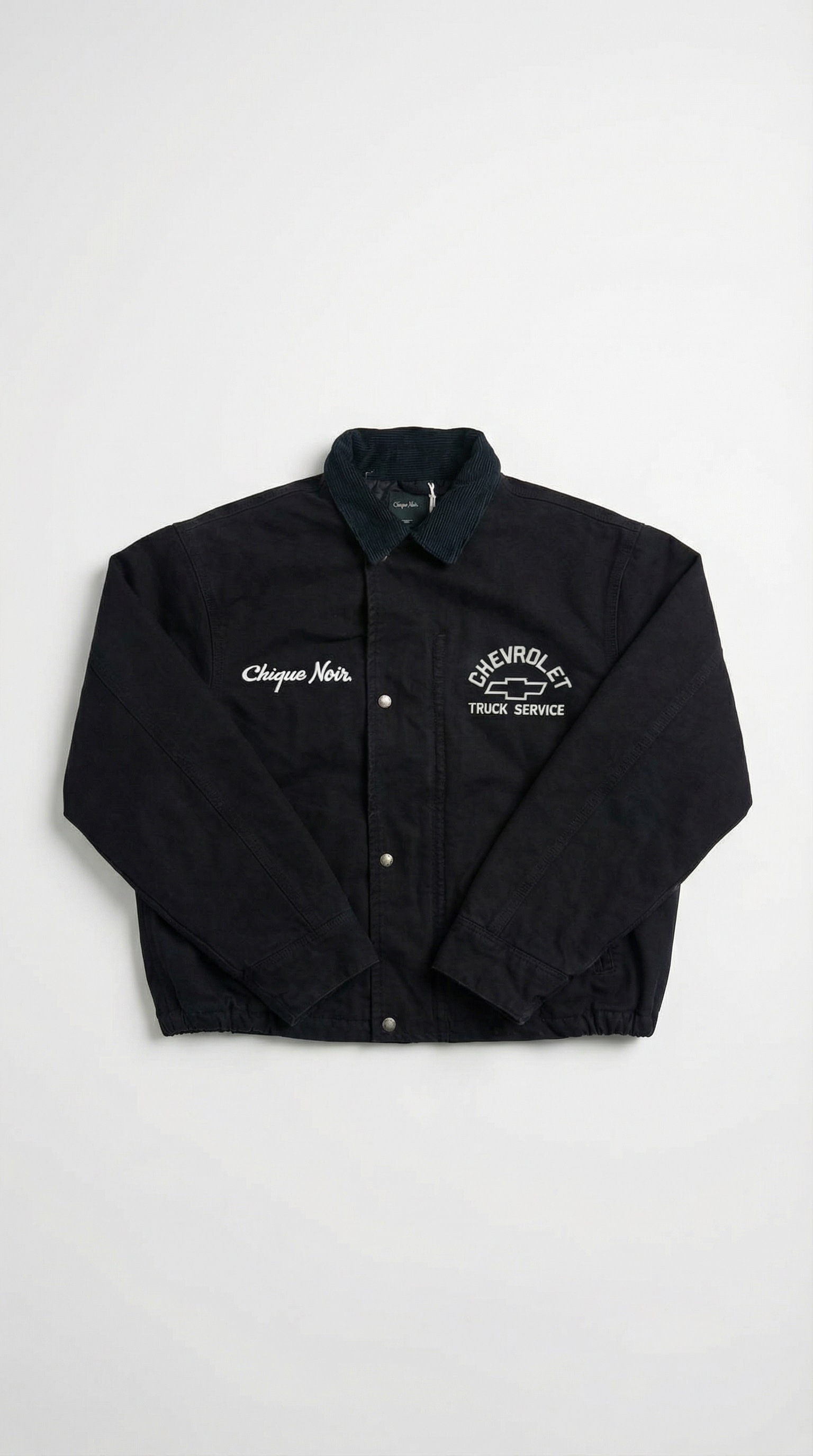 This worker jacket is crafted from durable cotton fabric and finished with a soft corduroy collar for added comfort. Designed with a relaxed, boxy fit that layers easily over hoodies, knits or tees.The jacket features a snap-button front closure, subtle branding on the chest and a bold graphic on the back, inspired by classic workwear and vintage truck.